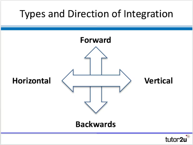 Forward and vertical - Acquiring a business further up in the supply chain Backward and vertical - Acquiring a business operating earlier in the supply chain Horizontal - Acquiring a business at the same stage of the supply chain Conglomerate - Where the acquisition has no clear connection to the business buying it